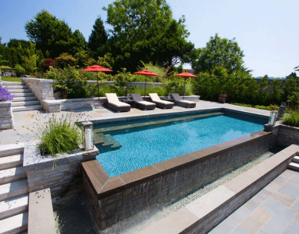 Elevated means parts or all the pool rises above the ground level. This might be positioning the pool in an above ground deck or it might be a necessity to permit sloping landscapes or might be an aesthetic option to increase your pool’s design appeal.